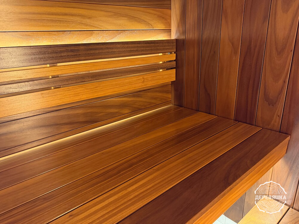 Так, вагонкой рейкой из абаш ТЕРМО обшит потолок, стены отделаны вагонкой в модном профиле STS из абаш ТЕРМО, а при изготовлении полков и подспинника использована полковая доска из абаш ТЕРМО.